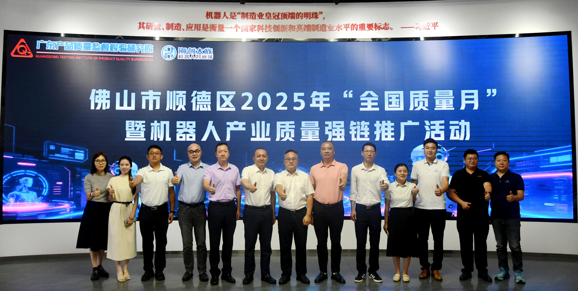 9月29日上午,为推动机器人产业链聚链成势、加速升级,佛山市顺德区市场监管局主办,我院顺德基地与广东海创大族机器人智造城联合承办2025年“全国质量月”暨机器人产业质量强链推广活动。佛山市市场监管局质量发展科科长刘义,顺德区市场监管局党组成员、区“小个专”党委专职副书记吴敏,我院顺德基地负责人海凌超,以及顺德区各镇街市场监管部门、机器人企业、行业协会的40余名代表参与活动。